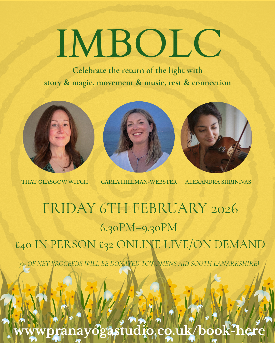 Join yoga teacher Carla Hillman-Webster, hedge witch and storyteller Geo (That Glasgow Witch), and musician Alexandra Shrinivas for an intimate, in-person celebration of Imbolc, the festival of Brìde and the first stirrings of spring.